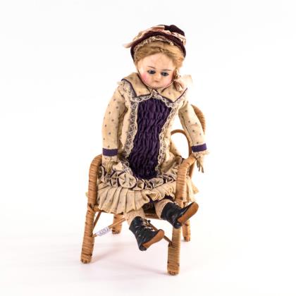 Wachsierter Brustkopf aus Papiermaché, blaue Schlafaugen, geschlossener Mund, blonde Mohairperücke. Weißer Lederkörper mit Kapok gestopft, mit einzeln abgenähten Fingern. Originales, helles Kleid mit violettem Einsatz, Samthut, schwarze Lederstiefelchen. Auf Korbstuhl