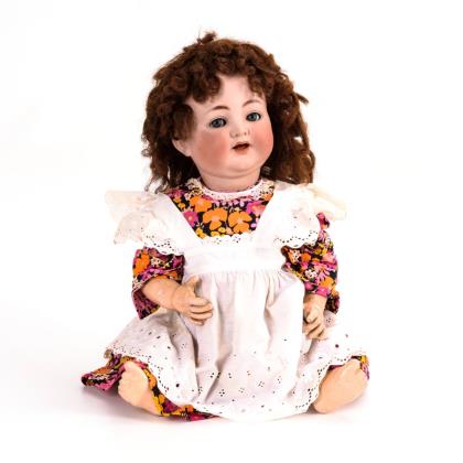 Kurbelkopf, blaue Schlaf-/Schelmenaugen, offener Mund, braune Kunsthaarperücke. 5-teiliger Sitzbabykörper. Bunt geblümtes Kleid mit weißer Schürze
