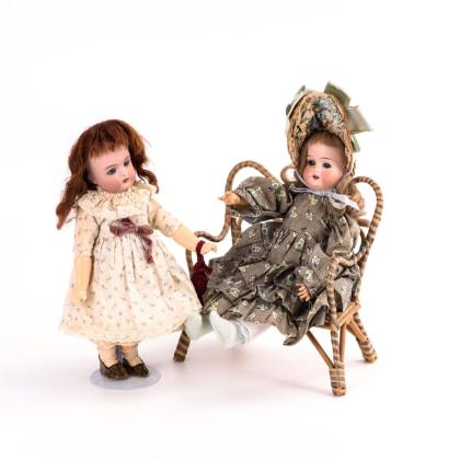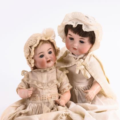 Beide mit Kurbelkopf, blauen Schlafaugen, offenem Mund, Sitzbabykörper, weißem Taufkleid und Häubchen. "Mein Lieblingsbaby" mit Resten einer blonden Mohairperücke. 1 Zahn fehlt, kurzer Brandriss an der Kopfkrone. AM-Baby mit brauner Echthaarperücke. 1 Chip am Augenrand