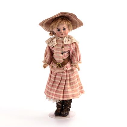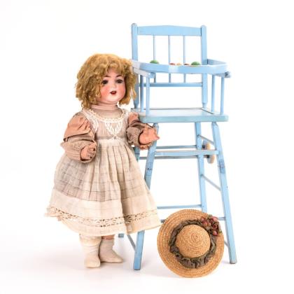 Kurbelkopf, blaue Schlafaugen, offener Mund, Zunge, blonde Kunsthaarperücke. 5-teiliger Stehpuppenkörper. Rosa braun gestreiftes Kleid mit heller Schürze, Strohhut. Dazu hellblaues, klappbares Hochstühlchen (H 72 cm)