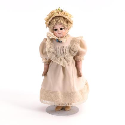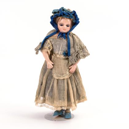 Leicht seitlich gedrehter Wachsschulterkopf, blaue Glasaugen, geschlossener Mund, einzeln eingestochene Echthaare. Weißer Stoffkörper mit wachsüberzogenen Halbarmen und Unterschenkeln. Hellblaues Originalkleid, Schutenhut, blaue Lederschuhe