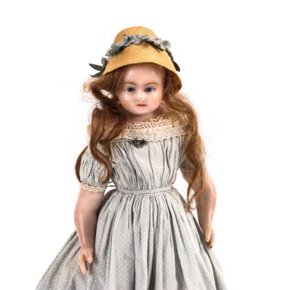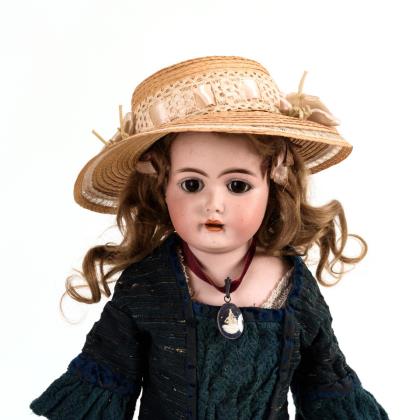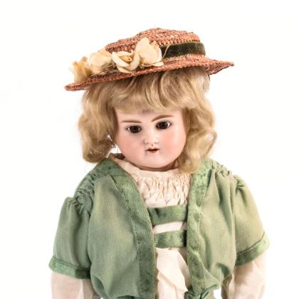 Brustkopf, feste braune Augen, offener Mund, Mohairperücke. Schlanker Ziegenlederkörper mit Biskuitunterarmen und gesplinteten Beinen. Grünes Kleid, Gürteltäschchen, Strohhut