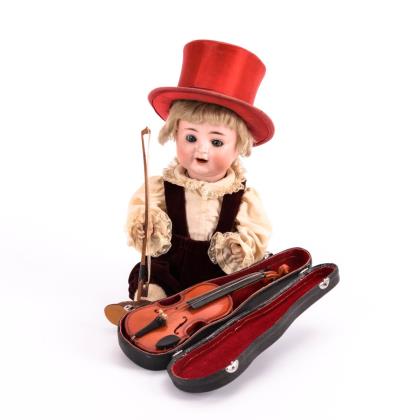 Kurbelkopf, blaue Schlafaugen ohne Lider, offener Mund, festgeklebte blonde Mohairperücke. 5-teiliger Sitzbabykörper. Braune Samthose, weißes Hemd, roter Zylinder und Geige