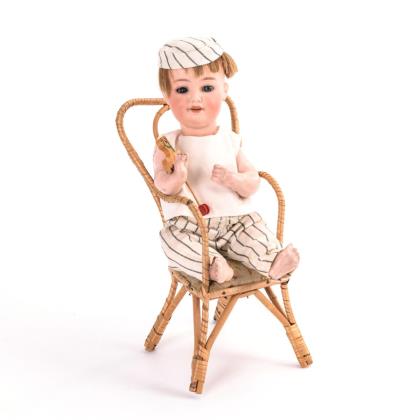 Kurbelkopf, blaue Schlafagen, offener Mund, blonde Echthaarperücke. 5-teiliger Sitzbabykörper. Heller Anzug, gestreiftes Mützchen. Dazu Rattan-Stuhl und kleines Steckenpferd
