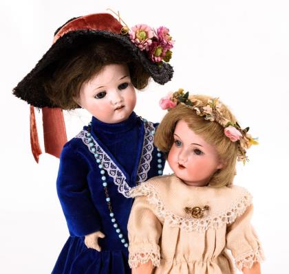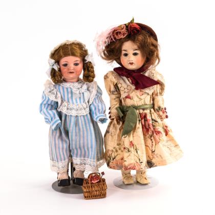 Beide mit Kurbelkopf, blauen Schlafaugen, Echthaarperücke und mehrteiligem Gliederkörper. 1x braunhaarig mit blauem Samtkleid und schwarzem Strohhut, 1x blond mit hellem Kleid und Haarkranz