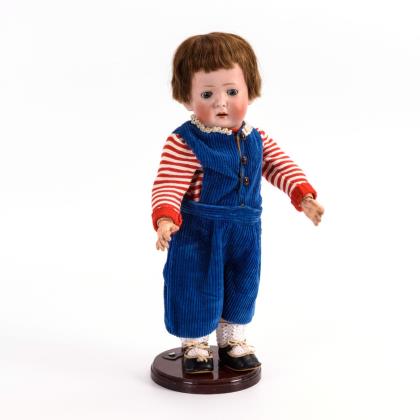 Kurbelkopf, blaue Schlafaugen, offener Mund, 2 Zähnchen, Zunge, braune Echthaarperücke. 17-teiliger Toddlerkörper. Blaue Cordhose, rot-weißer Ringelpulli
