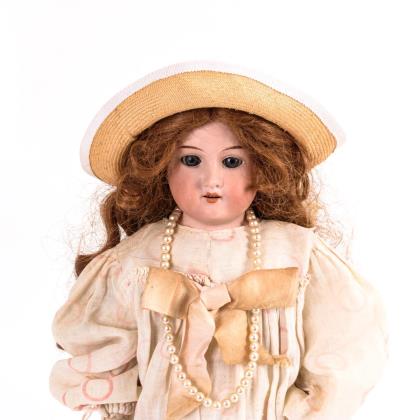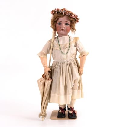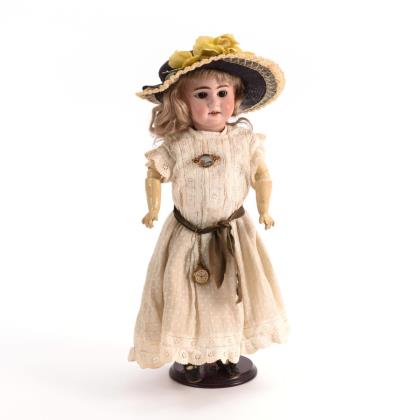 Kurbelkopf, braune Schlafaugen, offener Mund, gelockte Mohairperücke. 9-teiliger Gliederkörper mit langen Röhrenschenkeln. Weißes Kleid, grauer Strohhut, Brosche, Uhr