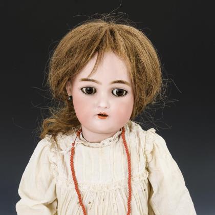 Leicht zur Seite gedrehter Brustkopf mit blauen Glasaugen, geschlossenem Mund und einzeln eingestochenen, braunen Echthaaren. Stoffkörper mit Vollwachshalbarmen und -beinen. Rosa Originalbekleidung, geschmückte Haube