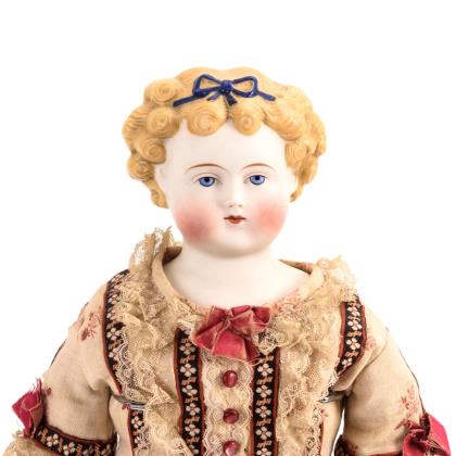 Heller "Parian"-Brustkopf mit gemalten blauen Augen und modellierter blonder Lockenfrisur. Stoffkörper mit restaurierten Porzellangliedern. Helles Kleid mit rot-braunen Borten, modellierte Stiefelchen
