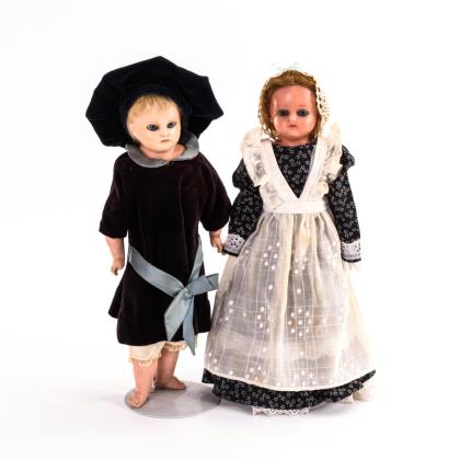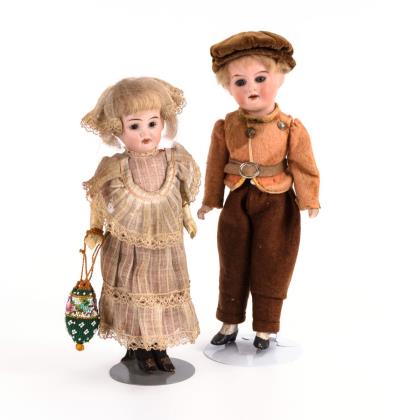 Beide mit Kurbelkopf, festen Glasaugen und blonder Mohaiperücke. Jeweils 5-teiliger Stehpuppenkörper. Knabe in brauner Filzkleidung, Mädchen in hellem Kleid