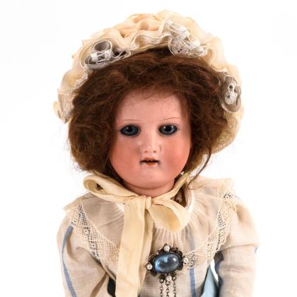 Kurbelkopf, blaue Glasaugen, offener Mund, braune Mohairperücke mit Flechtfrisur. 9-teiliger Gliederkörper. Weißes Kleid mit hellblauen Streifen, Häubchen, weiße Lederschuhe