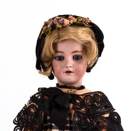 Kurbelkopf, blaue Schlafaugen, offener Mund, Ohrlöcher, blonde Mohairperücke. 15-teiliger Gliederkörper. Kariertes Kleid, schwarzer Kragen, schwarzes Samthäubchen