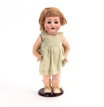 Kurbelkopf, blaue Schlafaugen, offene Nasenlöcher, offener Mund, blonde Mohairperücke. 5-teiliger Stehpuppenkörper. Hellgrünes Kleid, weiße Lackschuhe