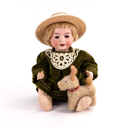 Kurbelkopf, blaue Schlafaugen, offener Mund, Zunge, blonde Mohairperücke. 5-teiliger Sitzbabykörper. Grüner Samtanzug mit weißem Kragen, Strohhut. Dazu kleiner, weißer Hund