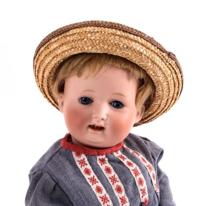 Kurbelkopf, blaue Schlafaugen, Wimpern, offener Mund, Zunge, blonde Mohairperücke. 15-teiliger Toddlerkörper. Nachgenähtes Kosakenhemd, rot-weiße Schuhe, Strohhut
