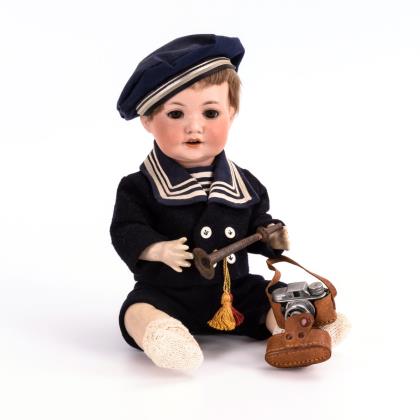 Kurbelkopf, braune Schlafaugen, offener Mund, blonde Mohairperücke. 5-teiliger Sitzbabykörper. Dunkelblauer Filzanzug, passendes Barett. Dazu Fotoapparat und Blechtröte