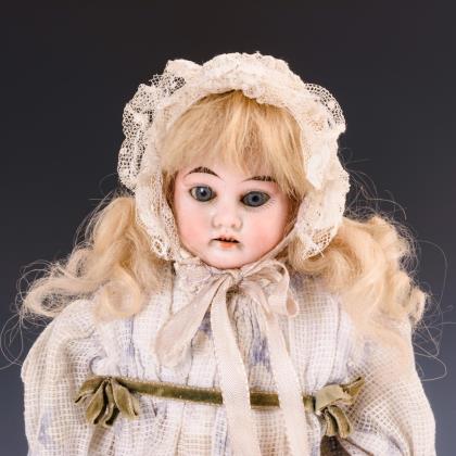 Blaue Schlafaugen, offener Mund, blonde Mohairperücke. Schlanker Lederkörper mit Biskuitunterarmen, Pozwickeln und Stoffbeinen. Helles Kleid, weiße Haube, schwarze Schuhe