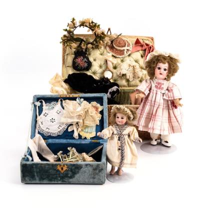 Kleine Französin mit Porzellankopf, braunen Augen und blonden Locken. In geflochtenem Köfferchen mit Zubehör, u.a. Sonnenschirm, Strohhut, Handspiegel, Samtkleid. / Kleines Püppchen mit braunen Augen und blonder Mohairperücke. In hellblauer Schatulle mit Unterwäsche, Handspiegel etc