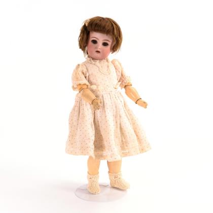 Kurbelkopf, braune Schlafaugen, Echthaarwimpern, offener Mund, braune Mohairperücke. 15-teiliger Gliederkörper. Helles Kleid mit roten Pünktchen