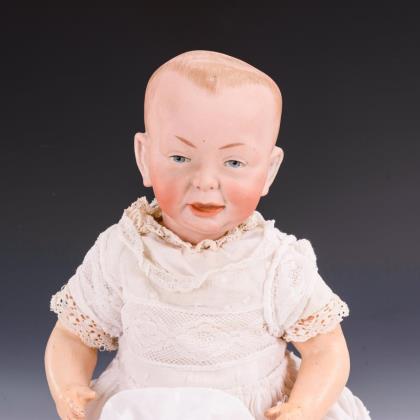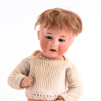 Kurbelkopf, blaue Schlafaugen, offen/geschlossener Mund, Mohairperücke. 5-teiliger Sitzbabykörper mit angewinkelten Beinen. Weißes Strick-Jüpchen