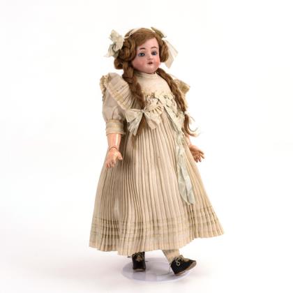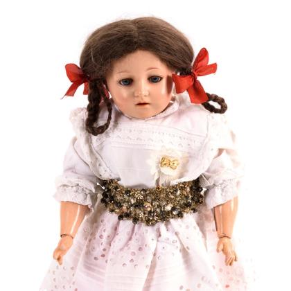Brustkopf, blaue Glasaugen, Wimpern, offener Mund mit Zahnreihe, braune Mohairperücke. Schlanker Wachstuchkörper mit Gliederarmen aus Holz. Weißes Kleid, rosa Unterkleid
