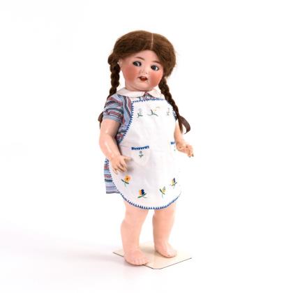 Kurbelkopf, blaue Schlaf-/Schelmenaugen, offener Mund, bewegliche Zunge, Pappzähnchen, festgeklebte braune Echthaarperücke. 5-teiliger Stehbabykörper. Gestreiftes Kleid, bestickte Schürze