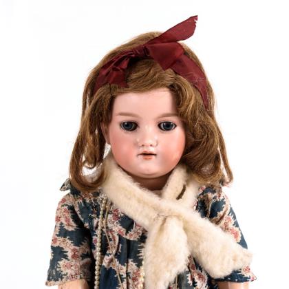 Brustkopf, feste blaue Augen, offener Mund, Ohrringe, dunkelblonde Mohairperücke. Körper aus Leder und Stoff, mit Biskuit-Unterarmen, Beine mit Po- und Kniezwickeln. Rotes Kleid, Häubchen, brauner Muff und Fellkragen