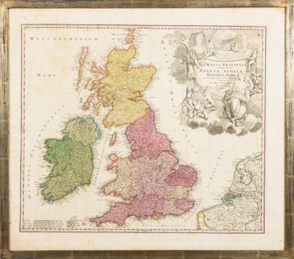 Detaillierte Landkarte der Britischen Inseln, große Titelkartusche mit Darstellung der Europa und Queen Anne (1665 - 1714): "Magna Britannia complectens Angliae Scotiae Hiberniae Regna [...]"
