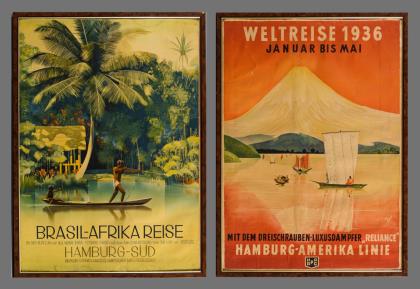 2 Plakate: "Brasil-Afrika Reise | 20.Okt. 36 - 16. Dez 36 mit M.S. Monte Rosa [...] Hamburg-Süd | Hamburg-Südamerikanische Dampfschifffahrts-Gesellschaft", in der Platte signiert "Anton" und "Weltreise 1936 Januar bis Mai | Mit dem Dreischrauben-Luxusdampfer "Reliance" Hamburg-Amerika Linie", in der Platte signiert "Fuss"