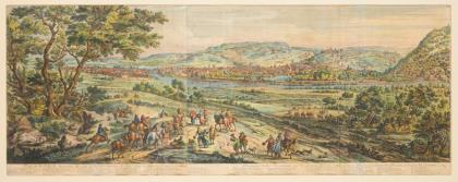 Sehr große zentralperspektivische Ansicht der französischen Stadt Besancon mit Umgebung, im Vordergrund mit Staffagefiguren, Legende in Französisch und Latein "Veue de la Ville de Besancon, du costé de Dole et Situation du lieu dans la franche Comté", nach einem Gemälde von Adam Frans van der Meulen (1632 - 1690)