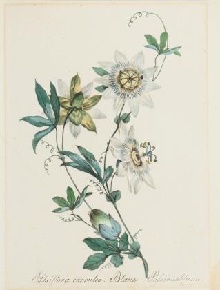 13 botanische Studien mit Bezeichnung in Latein und Deutsch: "Pelargonium Zonale - Gemeiner Storchschnabel", "Atropa Belladonna - Gemeine Wolfskirsche", "Asarum Europaeum - Europäische Haselwurz", "Daphne Mezereum - Gemeiner Kellerhals", "Hyoscyamus neyer - Schwarzes Bilsenkraut", "Lilium Martagon - Türkische Bundlilie", "Paeonie officinalis - Gemeine Pfingstrose", "Hypericum monogynum - Einweibige Johannis-Staude", "Tulipa striata - Gestreifte Tulpe", "Aconitum Napellus - Gemeiner Sturmhut", "Digitalis purpurea - Purpurrother Fingerhut", "Scabiosa atropurpurea - Dunkelpurpurne Scabiose", "Passiflora caerulea - Blaue Passionsblume"
