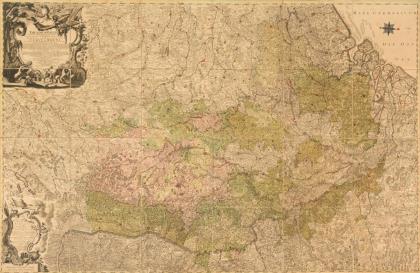 Große faltbare Landkarte aus 24 Blättern auf Leinwand, mit üppig gestalteter Titelkartusche in Latein: "Theatrum Belli Serenissimae Domus Austriacae [...]" und Kartusche mit Meilenzeiger in Deutsch: "Neuester Schauplatz des Krieges an dem Ober Rhein und in denen Niederlanden oder Lauff des Rheins von denen Waldstaedten ab bis zu dessen Ausfluß. So wohl die an diesem Flusse ligende Provintzien als auch einen grosen Theil von Franckreich vorstellend"