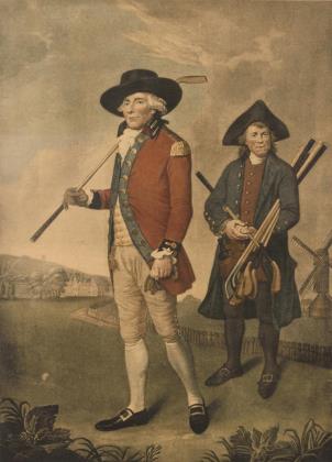 Jüngerer Nachdruck der Mezzotinto-Radierung nach einem Gemälde von Lemuel Francis Abbott, 1790: Bildnis des Golfers und Vorsitzenden der Vereinigung "The Blackheath Golfer" William Innes mit Golfschläger und seinem Caddie, der mehrere Golfschläger trägt, bezeichnet "To the Society of Goffers at Blackheath, This Plate is with just respect dedicated by their most humble servant, Lemuel Francis Abbott"