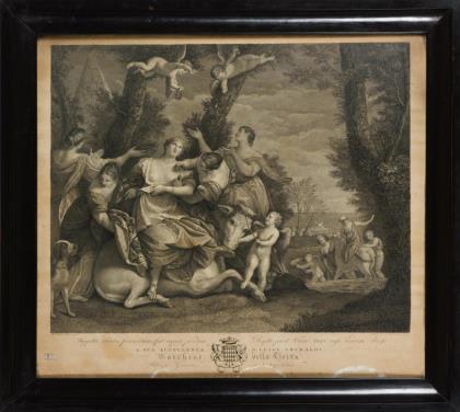 Nach einem Gemälde von Paolo Veronese (1528 - 1588), bezeichnet "Juppiter incutus faciem tauri fert aequore praedam. Rapta pavet Virgo, tauri ausa insidere dorso", "A Sua Eccelenza D. Luigi Grimaldi"