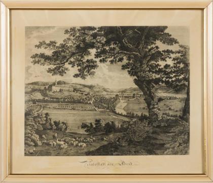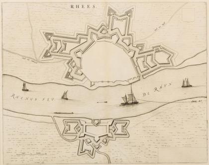 2-seitig verglastes Blatt mit Umriss der Stadt Reesa am Rhein aus der Vogelperspektive, bezeichnet "Rhees", verso Beschreibung in Latein, aus "Novus Atlas, Das ist, Weltbeschreibung / mit schönen newen außführlichen Land-Taffeln in Kupffer gestochen und an den Tag gegeben durch Guil"