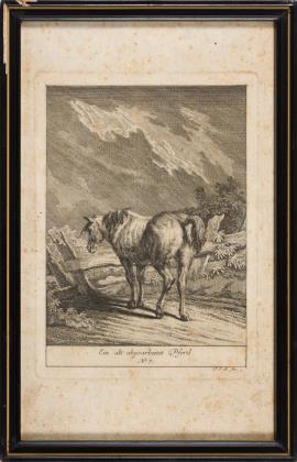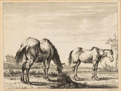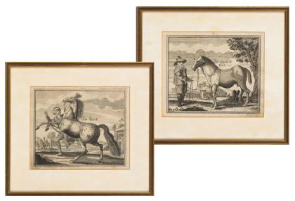 "Fig. 2" und "Fig. 6" aus einer Folge von Pferdedarstellungen: "Das ungestalte Pferd", Ecke unten rechts fehlt, Ränder etwas verschmutzt | "Ein Türck", etwas fleckig