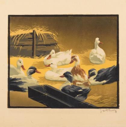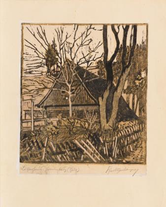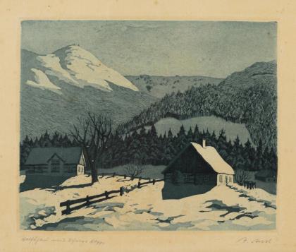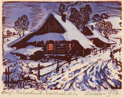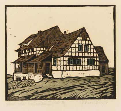 Farbholzschnitt "Fränkisches Bauernhaus (Heldritt)", Stock: 15 x 17,5 cm, Blatt: 22,5 x 29 cm, am Rand etwas geknickt | Fränkisches Bauernhaus in Winterlandschaft, Stock: 12,5 x 18,5 cm, Blatt: 23 x 31,5 cm | Fränkisches Bauernhaus, Stock: 18 x 13,5 cm, Blatt: 31 x 24 cm, am Rand mit Knicken, minimal stockfleckig | Farbholzschnitt "Stadttor Heldburg", Stock: 14,5 x 20,5 cm, Blatt: 22,5 x 29 cm, mit Knicken
