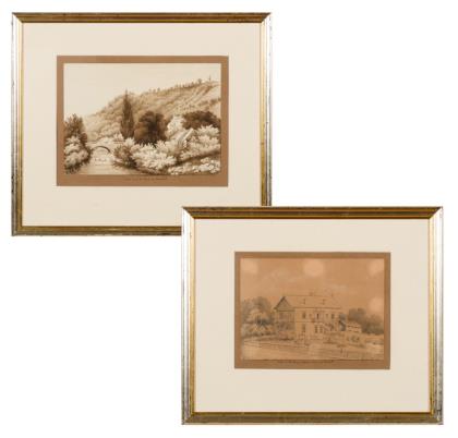 "Villa des Dr. Hering ("Willibald Alexis") zu Arnstadt", Bleistiftzeichnung, monogrammiert, datiert [18]53, Blatt: 15,5 x 22 cm, Rahmen: 33,5 x 40 cm, mit Lichtschaden | "Blick auf die Gera bei Arnstadt", Tuschzeichnung, monogrammiert, datiert [18]57 Blatt: 20 x 28 cm, Rahmen: 40 x 47 cm