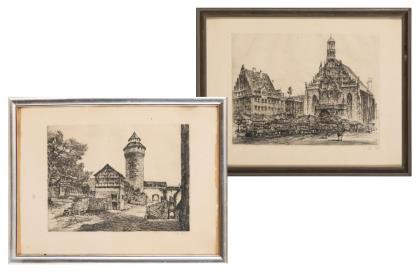 Betitelt "Nürnberg Vestnertorgraben", Platte: 22 x 28,5 cm, Rahmen: 32,5 x 43 cm | Frauenkirche am Hauptmarkt, Platte: 21 x28 cm, Rahmen: 32 x 40 cm