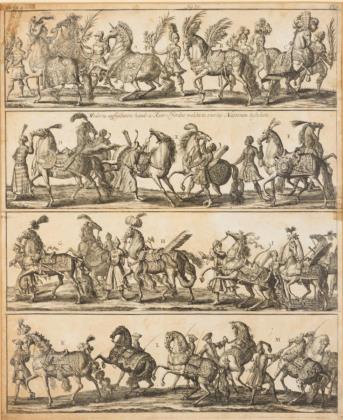 1 von 12 Darstellungen aus "Die Folge mit den Pferden", 1651. <strong>Nachtrag 17.10.2020: Es handelt sich um eine Radierung nach Dirk Stoop, ausgeführt von Chatelin</strong>