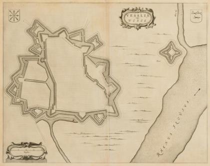 2-seitig verglastes Blatt mit Umriss der Hansestadt Wesel aus der Vogelperspektive, bezeichnet "Vesalia vulgo Wesel", verso Beschreibung in Latein, aus "Novus Atlas, Das ist, Weltbeschreibung / mit schönen newen außführlichen Land-Taffeln in Kupffer gestochen und an den Tag gegeben durch Guil"