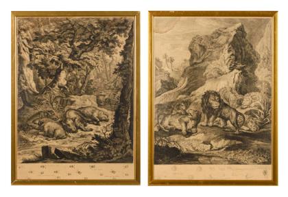 Realistische Darstellung der Wildtiere in ihrer natürlichen Umgebung, mit Abbildung der Fährten; aus: „Vorstellung der wilden Tiere - Gruendliche Beschreibung und Vorstellung der wilden Thiere nach ihrer Natur, Geschlecht, Alter und Spur.“, um 1733