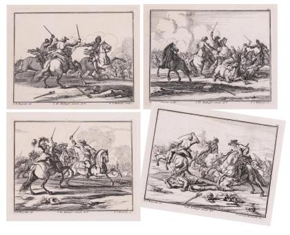 Blatt 10/11 aus der Folge A: "Kampf zwischen zwei Säbelkämpfern gegen zwei Reiter mit Pistolen", Blatt 6/8 aus der Folge B: "Gefecht von vier Reitern", Blatt 8/8 aus der Folge B: "Gefecht zwischen einem Einzelnen und einer Gruppe Anreitender" sowie Blatt 6/8 aus der Folge D "Reiterkampf"; bezeichnet mit Namenszügen der Künstler "G.P. Rugendas inv. et del., "G.C. Bodenehr Sc." und "I. El. Ridinger excud. A.V"