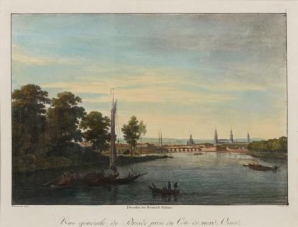 Blick vom Pieschener Hafen über die Elbe mit Bootsstaffage, bezeichnet: "Vue générale de Dresde prise du Còté de nord = Ouest."; nach einem Gemälde von Chirstian Gottlob Hammer, aus Heinrich Rittners "Dresden mit seinen Prachtgebäuden und schönsten Umgebungen", 1807