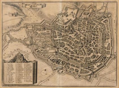 Plan der thüringischen Stadt Erfurt aus der Vogelperspektive, mit Legende; aus: "Theatrum Europaeum" (1633 - 1738)