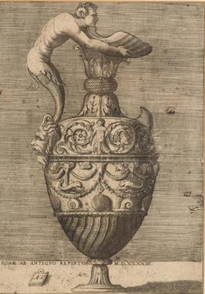 Reich ornamentierte Vase mit Faun als Henkel, bezeichnet: "Romae ab antiquo repertum MDXXXXIII", entspricht Blatt 13 einer Folge von Stichen römischer Vasen, deren Originale sich im Herzog Anton Ulrich-Museum Braunschweig befinden