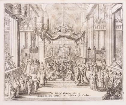 Krönungszeremonie des englischen Königspaares Wilhelm III. von Oranien-Nassau und Maria II. im prächtigen Westminster Abbey, bezeichnet: "Der Königl: Krönungs-Actus Wiliilmi III. und Mariae in England, zu Londen", aus Merians "Theatrum Europaeum", 1689