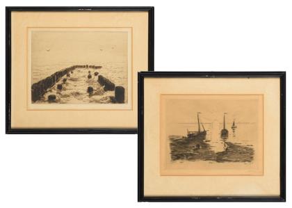 Boote im Sonnenuntergang, Platte: 25 x 33 cm, mit Lichtschaden | Meer mit Buhnen, Platte: 26 x 34,5 cm, Nr. 388