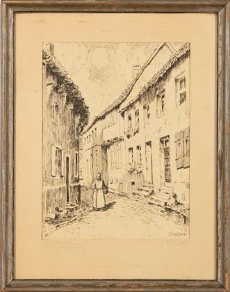 Alte Dame in einer Gasse <strong>| Nachtrag 20.10.2020: die Signatur deutet auf Elli Grützner (1898 -1977) und nicht auf Eduard von Grützner</strong>