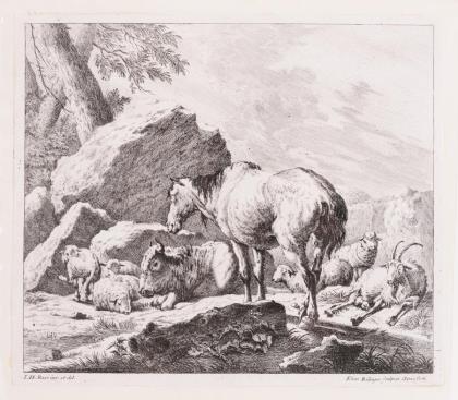 No. 7: "Ein alt abgearbeitet Pferd", "No. 8: Eine gar alte Schind Gurre", "No. 9: Gutschen Pferde", "No. 18: "Das vordere Leit-Roß am Wagen", "No. 19: Cüraßier oder Soldaten Pferd", "No. 21: Saumer, Targ oder Saum pferd" und "No. 29: "Mault Thier von hinten"; aus: "Entwurff einiger Thiere, wie solche nach ihren unterschiedenen Arten / Actionen und Leidenschafften, nach dem Leben gezeichnet, samt beygefügten Anmerckungen. Theil 7: Entwurff einiger Maul-Thiere und Esel, nach ihren unterschiedlichen Arten und Gebrauche nach dem Leben gezeichnet, 1754"